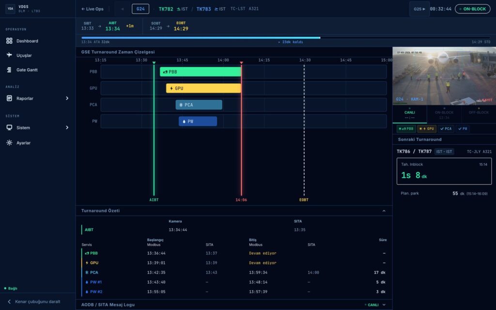Sistem, havalimanı apronundaki VDGS direklerinde bulunan kameralar aracılığıyla uçakların ve yer ekipmanlarının park pozisyonundaki tüm hareketlerini yüksek doğrulukla tespit ediyor, gerçek zamanlı izleyerek ilgililere gerekli bilgileri sağlıyor. Geleneksel sistemlere kıyasla daha hızlı, güvenli ve verimli operasyon imkânı sunan çözüm, insan hatasını minimize ederek apron güvenliğini de önemli ölçüde artırıyor.